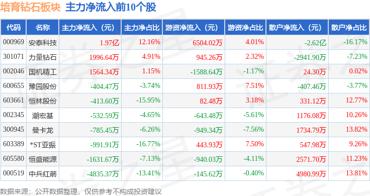 从资金流向上来看,当日培育钻石板块主力资金净流出1.65亿元,游资资金净流入1.17亿元,散户资金净流入4823.42万元。培育钻石板块个股资金流向见下表: