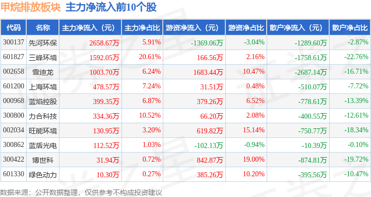 从资金流向上来看,当日甲烷排放板块主力资金净流入1212.69万元,游资资金净流入3275.65万元,散户资金净流出4488.34万元。甲烷排放板块个股资金流向见下表: