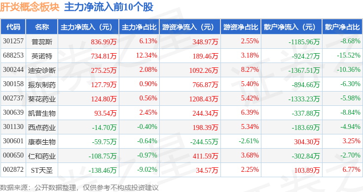 从资金流向上来看,当日肝炎概念板块主力资金净流出2.67亿元,游资资金净流入9540.42万元,散户资金净流入1.72亿元。肝炎概念板块个股资金流向见下表: