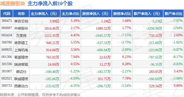 从资金流向上来看,当日减速器板块主力资金净流出5.62亿元,游资资金净流入1.3亿元,散户资金净流入4.33亿元。减速器板块个股资金流向见下表: