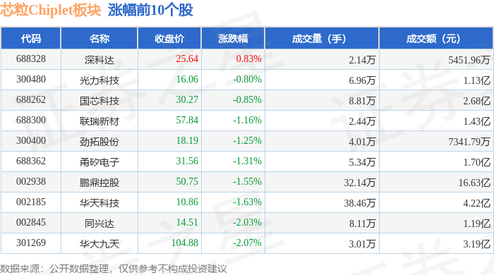 证券之星消息,12月11日芯粒Chiplet板块较上一交易日下跌2.55%,南亚新材领跌。当日上证指数报收于3873.32,下跌0.7%。深证成指报收于13147.39,下跌1.27%。芯粒Chiplet板块个股涨跌见下表:
