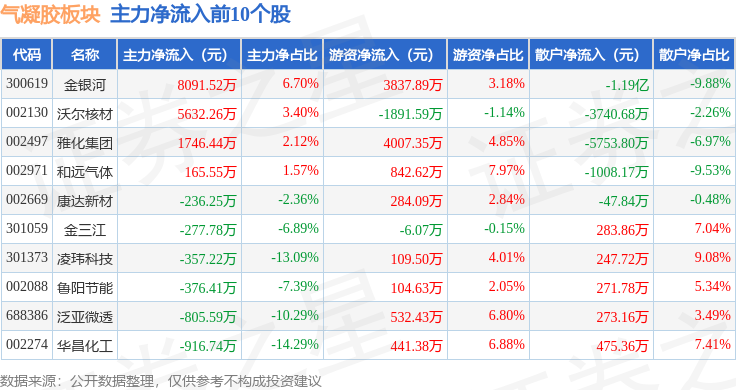 从资金流向上来看,当日气凝胶板块主力资金净流出5080.45万元,游资资金净流入8418.7万元,散户资金净流出3338.25万元。气凝胶板块个股资金流向见下表: