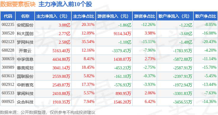 从资金流向上来看,当日数据要素板块主力资金净流出15.55亿元,游资资金净流入1.57亿元,散户资金净流入13.98亿元。数据要素板块个股资金流向见下表: