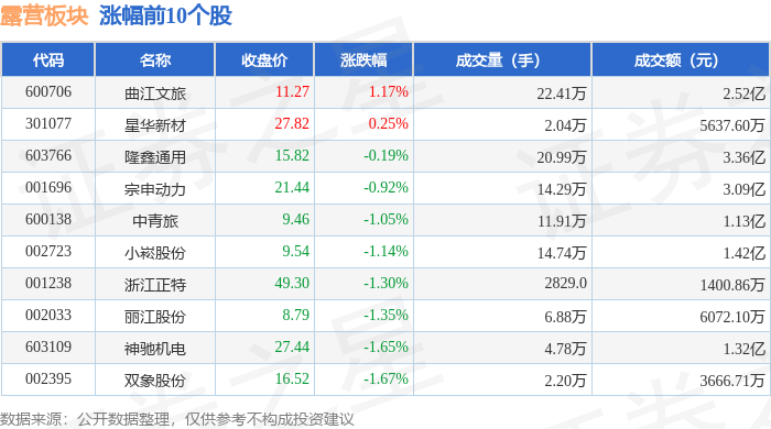 证券之星消息,12月11日露营板块较上一交易日下跌2.18%,嘉麟杰领跌。当日上证指数报收于3873.32,下跌0.7%。深证成指报收于13147.39,下跌1.27%。露营板块个股涨跌见下表:
