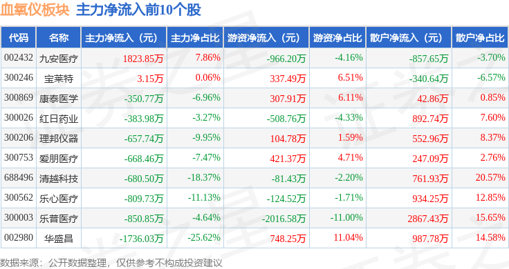 从资金流向上来看,当日血氧仪板块主力资金净流出2.45亿元,游资资金净流出1417.86万元,散户资金净流入2.59亿元。血氧仪板块个股资金流向见下表: