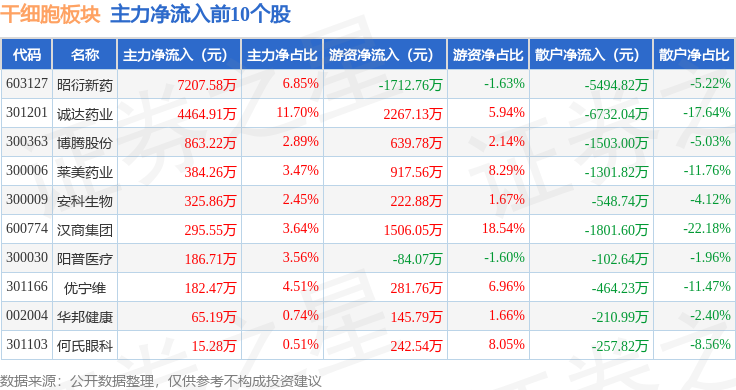 从资金流向上来看,当日干细胞板块主力资金净流出1.2亿元,游资资金净流入8495.45万元,散户资金净流入3528.66万元。干细胞板块个股资金流向见下表: