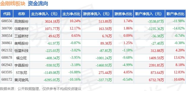 从资金流向上来看,当日金刚线板块主力资金净流出5024.84万元,游资资金净流出1838.7万元,散户资金净流入6863.54万元。金刚线板块个股资金流向见下表: