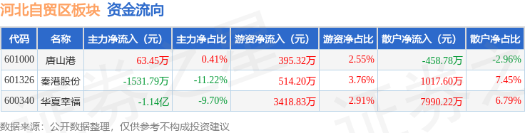 从资金流向上来看,当日河北自贸区板块主力资金净流出1.29亿元,游资资金净流入4328.35万元,散户资金净流入8549.04万元。河北自贸区板块个股资金流向见下表:
