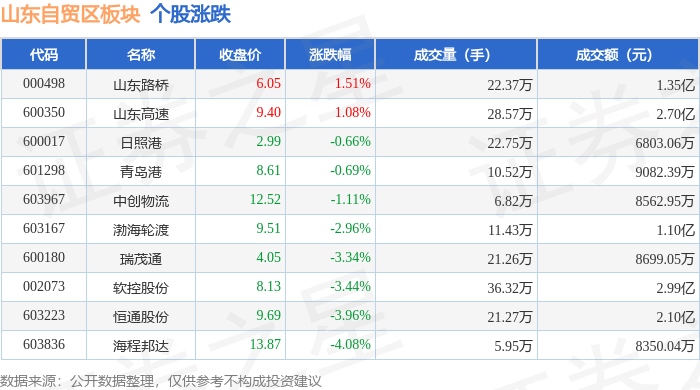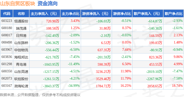 从资金流向上来看,当日山东自贸区板块主力资金净流出8063.56万元,游资资金净流入9506.79万元,散户资金净流出1443.23万元。山东自贸区板块个股资金流向见下表: