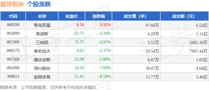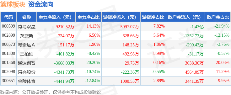 从资金流向上来看,当日篮球板块主力资金净流出2827.76万元,游资资金净流入7174.89万元,散户资金净流出4347.13万元。篮球板块个股资金流向见下表: