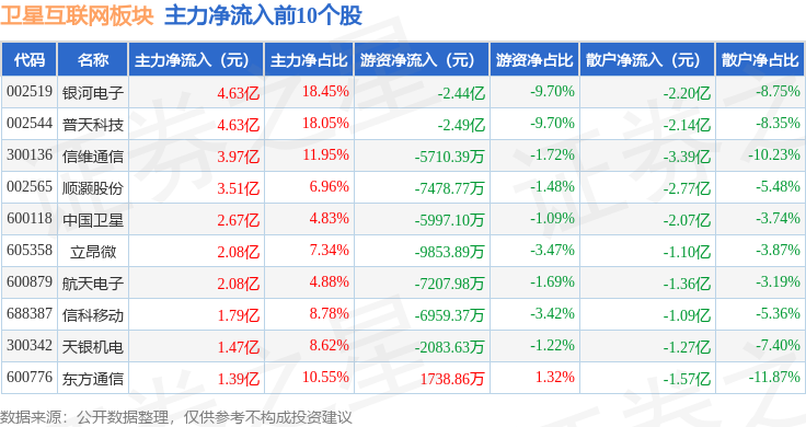 从资金流向上来看,当日卫星互联网板块主力资金净流出39.18亿元,游资资金净流入1.92亿元,散户资金净流入37.26亿元。卫星互联网板块个股资金流向见下表: