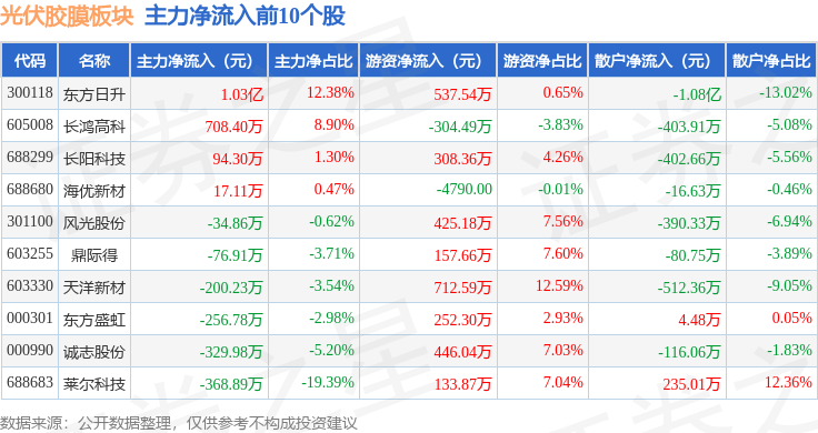 从资金流向上来看,当日光伏胶膜板块主力资金净流出6.03亿元,游资资金净流入1.57亿元,散户资金净流入4.46亿元。光伏胶膜板块个股资金流向见下表: