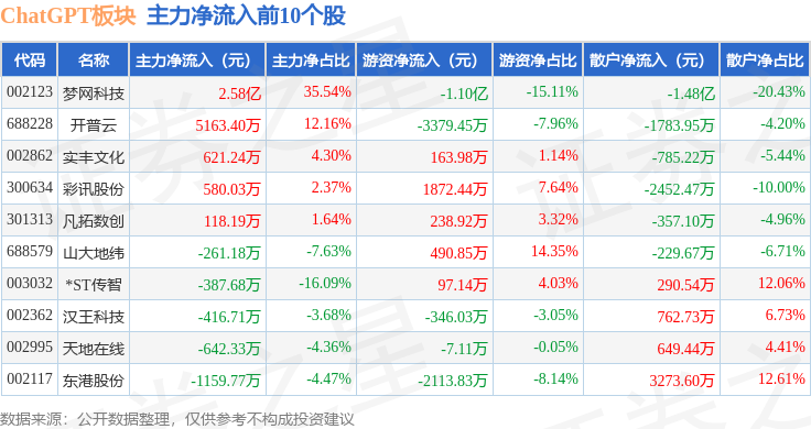 从资金流向上来看,当日ChatGPT板块主力资金净流出41.32亿元,游资资金净流入4.86亿元,散户资金净流入36.45亿元。ChatGPT板块个股资金流向见下表:
