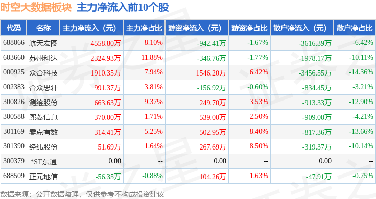 从资金流向上来看,当日时空大数据板块主力资金净流出5.94亿元,游资资金净流入7569.06万元,散户资金净流入5.18亿元。时空大数据板块个股资金流向见下表: