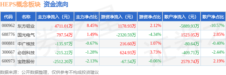 从资金流向上来看,当日HEPS概念板块主力资金净流入2645.16万元,游资资金净流出367.67万元,散户资金净流出2277.49万元。HEPS概念板块个股资金流向见下表: