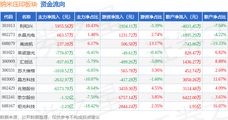 从资金流向上来看,当日纳米压印板块主力资金净流出4.06亿元,游资资金净流入1.25亿元,散户资金净流入2.81亿元。纳米压印板块个股资金流向见下表: