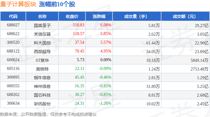 证券之星消息,12月11日量子计算板块较上一交易日上涨1.3%,国盾量子领涨。当日上证指数报收于3873.32,下跌0.7%。深证成指报收于13147.39,下跌1.27%。量子计算板块个股涨跌见下表: