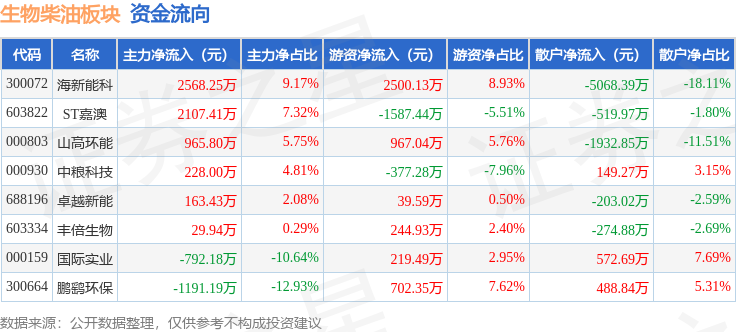 从资金流向上来看,当日生物柴油板块主力资金净流入4079.47万元,游资资金净流入2708.82万元,散户资金净流出6788.29万元。生物柴油板块个股资金流向见下表: