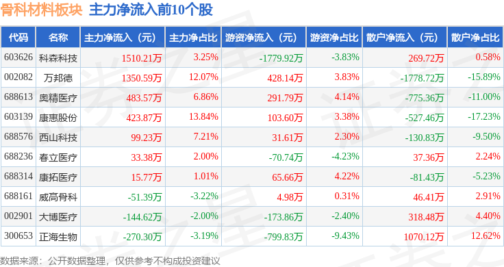 从资金流向上来看,当日骨科材料板块主力资金净流出4501.55万元,游资资金净流入1586.2万元,散户资金净流入2915.35万元。骨科材料板块个股资金流向见下表: