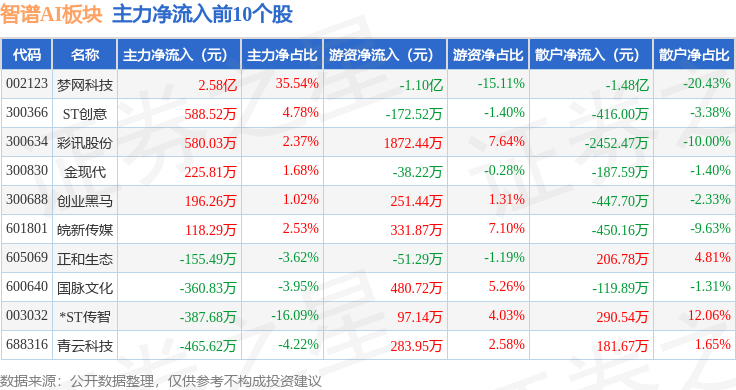 从资金流向上来看,当日智谱AI板块主力资金净流出21.25亿元,游资资金净流入3.35亿元,散户资金净流入17.89亿元。智谱AI板块个股资金流向见下表:
