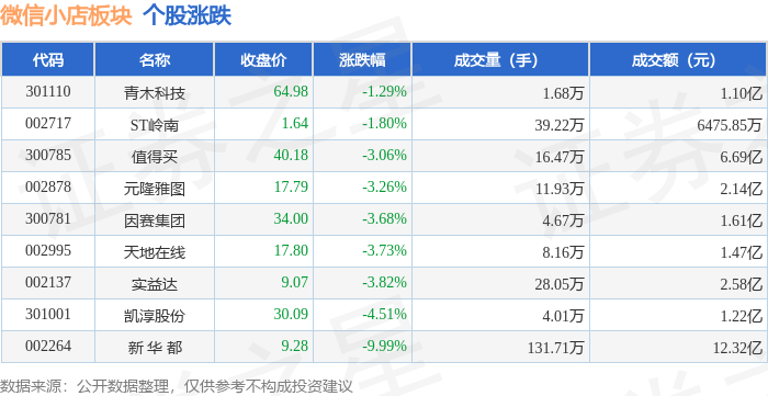 证券之星消息,12月11日微信小店板块较上一交易日下跌4.38%,新 华 都领跌。当日上证指数报收于3873.32,下跌0.7%。深证成指报收于13147.39,下跌1.27%。微信小店板块个股涨跌见下表: