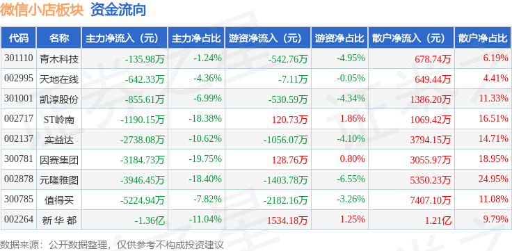 从资金流向上来看,当日微信小店板块主力资金净流出3.15亿元,游资资金净流出3938.8万元,散户资金净流入3.55亿元。微信小店板块个股资金流向见下表:
