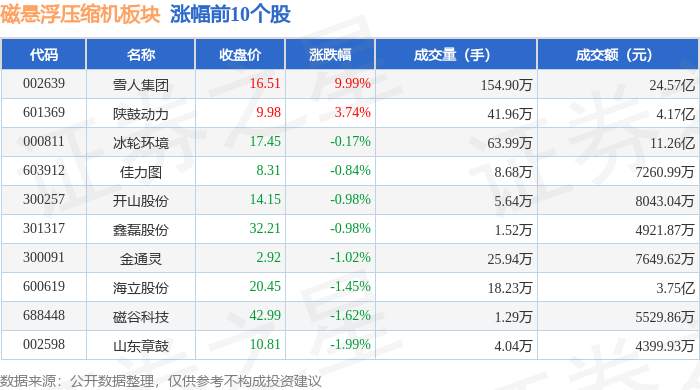 从资金流向上来看,当日磁悬浮压缩机板块主力资金净流入6.24亿元,游资资金净流出3.33亿元,散户资金净流出2.9亿元。磁悬浮压缩机板块个股资金流向见下表: