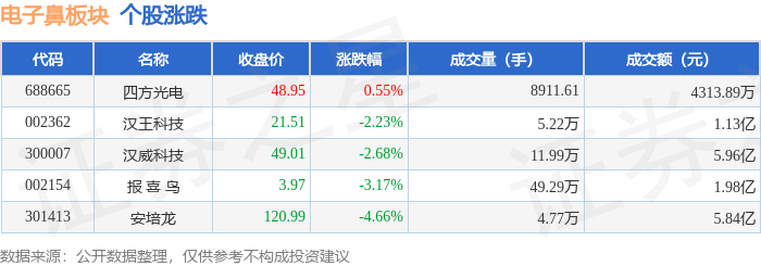 证券之星消息,12月11日电子鼻板块较上一交易日下跌2.65%,安培龙领跌。当日上证指数报收于3873.32,下跌0.7%。深证成指报收于13147.39,下跌1.27%。电子鼻板块个股涨跌见下表: