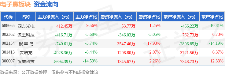 从资金流向上来看,当日电子鼻板块主力资金净流出1.44亿元,游资资金净流入5807.68万元,散户资金净流入8559.95万元。电子鼻板块个股资金流向见下表: