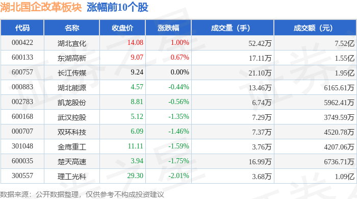 从资金流向上来看,当日湖北国企改革板块主力资金净流出9.94亿元,游资资金净流入4.19亿元,散户资金净流入5.75亿元。湖北国企改革板块个股资金流向见下表: