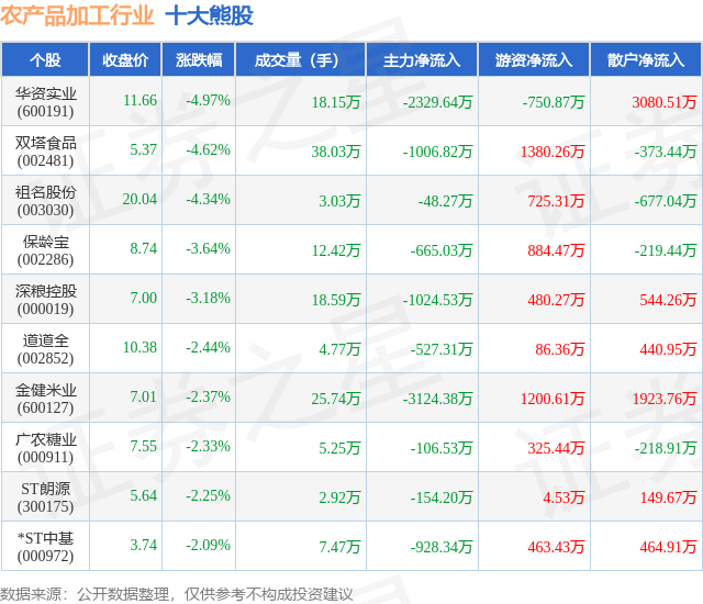个股表现方面,农产品加工行业当日领跌股为华资实业(600191),该股当日报收11.66,下跌4.97%,成交量18.15万,主力资金净流出2329.64万元。双塔食品(002481)以下跌4.62%紧随其后,该股当日成交量38.03万,主力资金净流出1006.82万元。除此之外,祖名股份(003030)、保龄宝(002286)、深粮控股(000019)均进入当日熊股之列。具体个股列表见下表: