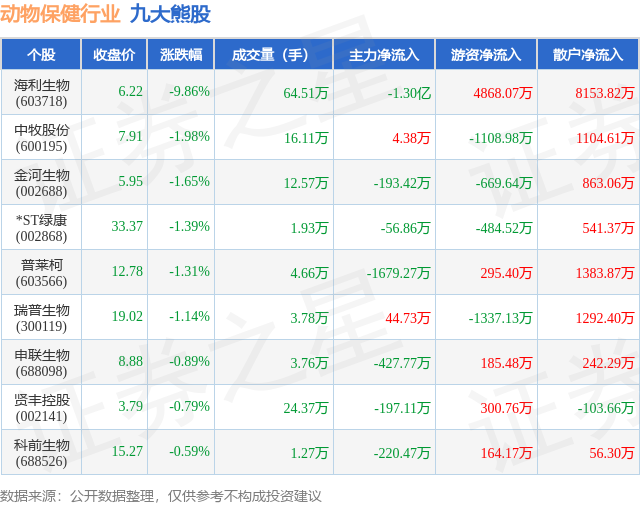 个股表现方面,动物保健行业当日领跌股为海利生物(603718),该股当日报收6.22,下跌9.86%,成交量64.51万,主力资金净流出1.3亿元。中牧股份(600195)以下跌1.98%紧随其后,该股当日成交量16.11万,主力资金净流入4.38万元。除此之外,金河生物(002688)、*ST绿康(002868)、普莱柯(603566)均进入当日熊股之列。具体个股列表见下表: