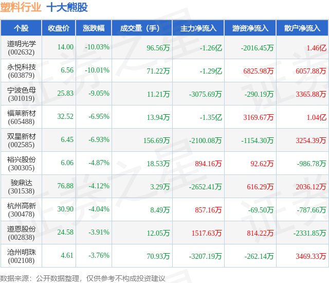 个股表现方面,塑料行业当日领跌股为道明光学(002632),该股当日报收14.0,下跌10.03%,成交量96.56万,主力资金净流出1.26亿元。永悦科技(603879)以下跌10.01%紧随其后,该股当日成交量71.22万,主力资金净流出1.29亿元。除此之外,宁波色母(301019)、福莱新材(605488)、双星新材(002585)均进入当日熊股之列。具体个股列表见下表: