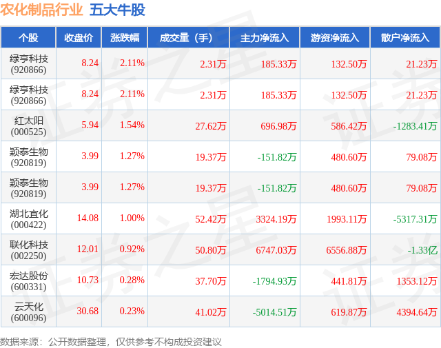 个股表现方面,农化制品行业当日领涨股为绿亨科技(920866),该股当日报收8.24,上涨2.11%,成交量2.31万,主力资金净流入185.33万元。绿亨科技(920866)以上涨2.11%紧随其后,该股当日成交量2.31万,主力资金净流入185.33万元。除此之外,红太阳(000525)、颖泰生物(920819)、颖泰生物(920819)均进入当日牛股之列。具体个股列表见下表: