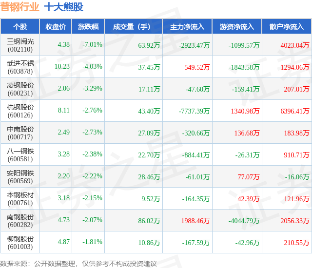 个股表现方面,普钢行业当日领跌股为三钢闽光(002110),该股当日报收4.38,下跌7.01%,成交量63.92万,主力资金净流出2923.47万元。武进不锈(603878)以下跌4.03%紧随其后,该股当日成交量37.45万,主力资金净流入549.52万元。除此之外,凌钢股份(600231)、杭钢股份(600126)、中南股份(000717)均进入当日熊股之列。具体个股列表见下表: