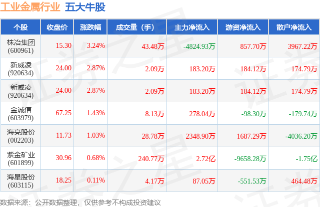 个股表现方面,工业金属行业当日领涨股为株冶集团(600961),该股当日报收15.3,上涨3.24%,成交量43.48万,主力资金净流出4824.93万元。新威凌(920634)以上涨2.87%紧随其后,该股当日成交量2.09万,主力资金净流入183.2万元。除此之外,新威凌(920634)、金诚信(603979)、海亮股份(002203)均进入当日牛股之列。具体个股列表见下表: