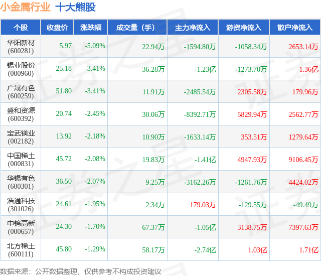 个股表现方面,小金属行业当日领跌股为华阳新材(600281),该股当日报收5.97,下跌5.09%,成交量22.94万,主力资金净流出1594.8万元。锡业股份(000960)以下跌3.41%紧随其后,该股当日成交量36.28万,主力资金净流出1.23亿元。除此之外,广晟有色(600259)、盛和资源(600392)、宝武镁业(002182)均进入当日熊股之列。具体个股列表见下表: