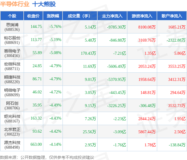 个股表现方面,半导体行业当日领跌股为思瑞浦(688536),该股当日报收144.75,下跌5.76%,成交量5.14万,主力资金净流出9785.3万元。灿芯股份(688691)以下跌5.19%紧随其后,该股当日成交量5.48万,主力资金净流出846.88万元。除此之外,赛微电子(300456)、宏微科技(688711)、翱捷科技(688220)均进入当日熊股之列。具体个股列表见下表: