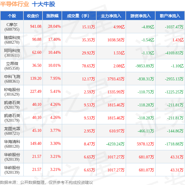 个股表现方面,半导体行业当日领涨股为C摩尔(688795),该股当日报收941.08,上涨28.04%,成交量15.11万,主力资金净流入4.99亿元。臻镭科技(688270)以上涨17.4%紧随其后,该股当日成交量35.35万,主力资金净流入1038.58万元。除此之外,珂玛科技(301611)、立昂微(605358)、中科飞测(688361)均进入当日牛股之列。具体个股列表见下表:
