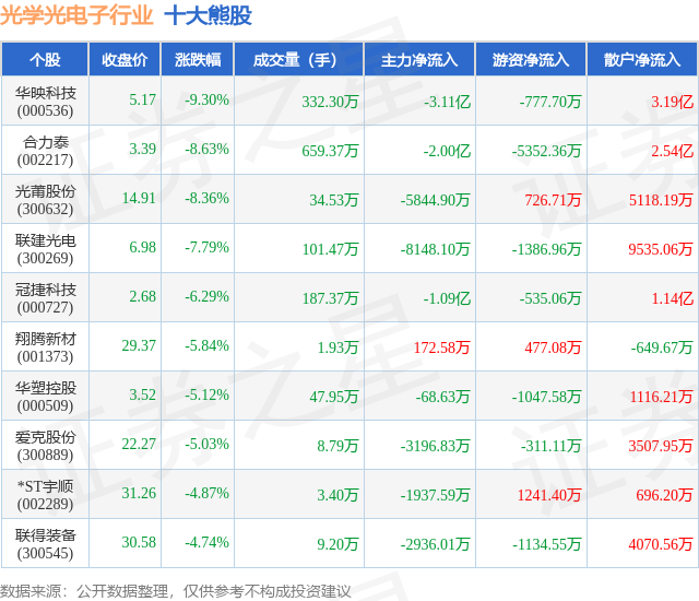 个股表现方面,光学光电子行业当日领跌股为华映科技(000536),该股当日报收5.17,下跌9.3%,成交量332.3万,主力资金净流出3.11亿元。合力泰(002217)以下跌8.63%紧随其后,该股当日成交量659.37万,主力资金净流出2.0亿元。除此之外,光莆股份(300632)、联建光电(300269)、冠捷科技(000727)均进入当日熊股之列。具体个股列表见下表:
