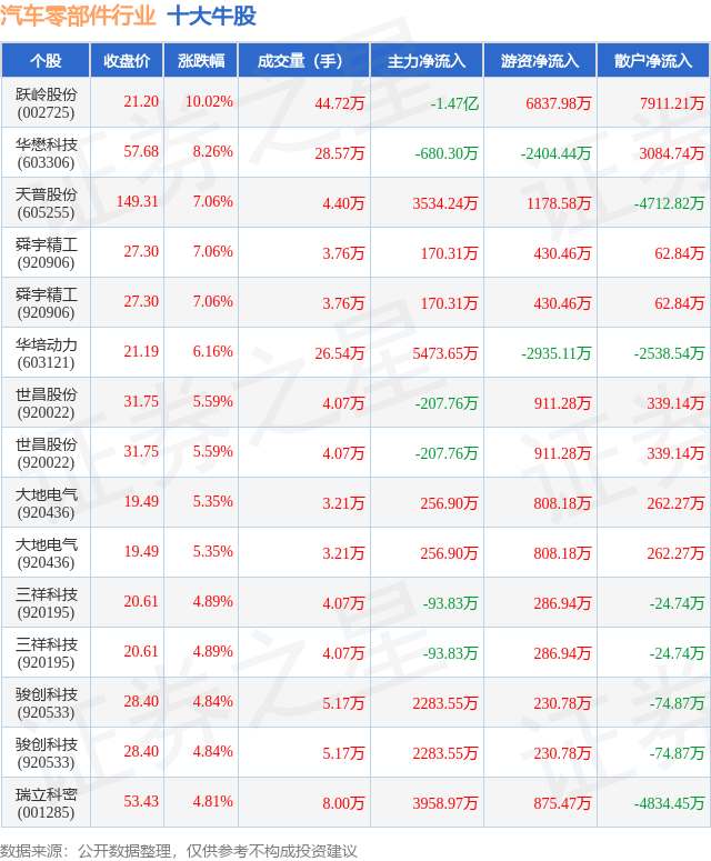 个股表现方面,汽车零部件行业当日领涨股为跃岭股份(002725),该股当日报收21.2,上涨10.02%,成交量44.72万,主力资金净流出1.47亿元。华懋科技(603306)以上涨8.26%紧随其后,该股当日成交量28.57万,主力资金净流出680.3万元。除此之外,天普股份(605255)、舜宇精工(920906)、舜宇精工(920906)均进入当日牛股之列。具体个股列表见下表:
