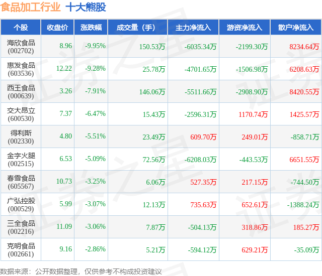 个股表现方面,食品加工行业当日领跌股为海欣食品(002702),该股当日报收8.96,下跌9.95%,成交量150.53万,主力资金净流出6035.34万元。惠发食品(603536)以下跌9.28%紧随其后,该股当日成交量25.78万,主力资金净流出4701.65万元。除此之外,西王食品(000639)、交大昂立(600530)、得利斯(002330)均进入当日熊股之列。具体个股列表见下表: