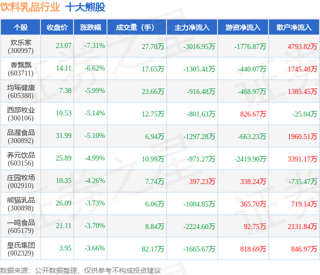 个股表现方面,饮料乳品行业当日领跌股为欢乐家(300997),该股当日报收23.07,下跌7.31%,成交量27.78万,主力资金净流出3016.95万元。香飘飘(603711)以下跌6.62%紧随其后,该股当日成交量17.65万,主力资金净流出1305.41万元。除此之外,均瑶健康(605388)、西部牧业(300106)、品渥食品(300892)均进入当日熊股之列。具体个股列表见下表: