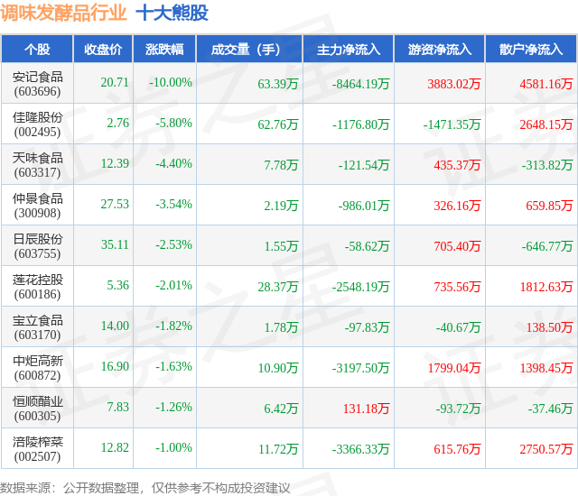 个股表现方面,调味发酵品行业当日领跌股为安记食品(603696),该股当日报收20.71,下跌10.0%,成交量63.39万,主力资金净流出8464.19万元。佳隆股份(002495)以下跌5.8%紧随其后,该股当日成交量62.76万,主力资金净流出1176.8万元。除此之外,天味食品(603317)、仲景食品(300908)、日辰股份(603755)均进入当日熊股之列。具体个股列表见下表: