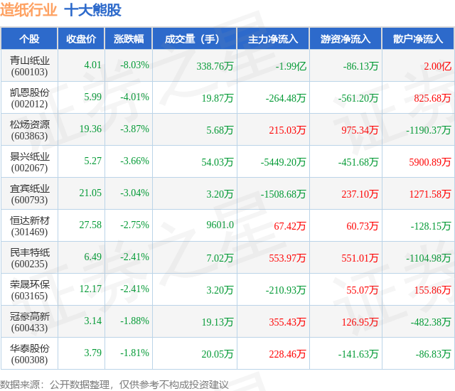 个股表现方面,造纸行业当日领跌股为青山纸业(600103),该股当日报收4.01,下跌8.03%,成交量338.76万,主力资金净流出1.99亿元。凯恩股份(002012)以下跌4.01%紧随其后,该股当日成交量19.87万,主力资金净流出264.48万元。除此之外,松炀资源(603863)、景兴纸业(002067)、宜宾纸业(600793)均进入当日熊股之列。具体个股列表见下表: