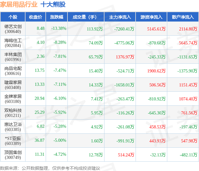 个股表现方面,家居用品行业当日领跌股为德艺文创(300640),该股当日报收8.48,下跌13.38%,成交量113.92万,主力资金净流出7260.41万元。海鸥住工(002084)以下跌8.28%紧随其后,该股当日成交量74.09万,主力资金净流出4775.06万元。除此之外,丰林集团(601996)、尚品宅配(300616)、建霖家居(603408)均进入当日熊股之列。具体个股列表见下表: