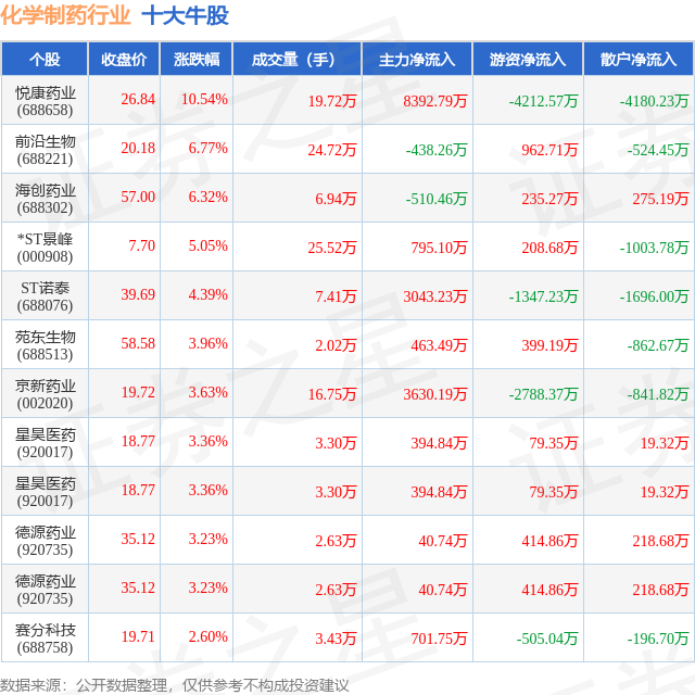 个股表现方面,化学制药行业当日领涨股为悦康药业(688658),该股当日报收26.84,上涨10.54%,成交量19.72万,主力资金净流入8392.79万元。前沿生物(688221)以上涨6.77%紧随其后,该股当日成交量24.72万,主力资金净流出438.26万元。除此之外,海创药业(688302)、*ST景峰(000908)、ST诺泰(688076)均进入当日牛股之列。具体个股列表见下表: