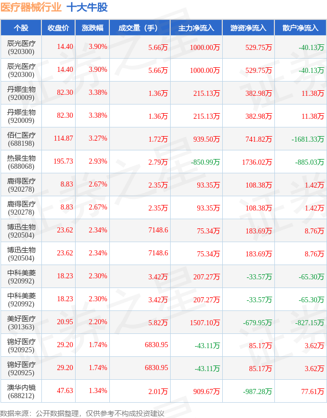 个股表现方面,医疗器械行业当日领涨股为辰光医疗(920300),该股当日报收14.4,上涨3.9%,成交量5.66万,主力资金净流入1000.0万元。辰光医疗(920300)以上涨3.9%紧随其后,该股当日成交量5.66万,主力资金净流入1000.0万元。除此之外,丹娜生物(920009)、丹娜生物(920009)、佰仁医疗(688198)均进入当日牛股之列。具体个股列表见下表: