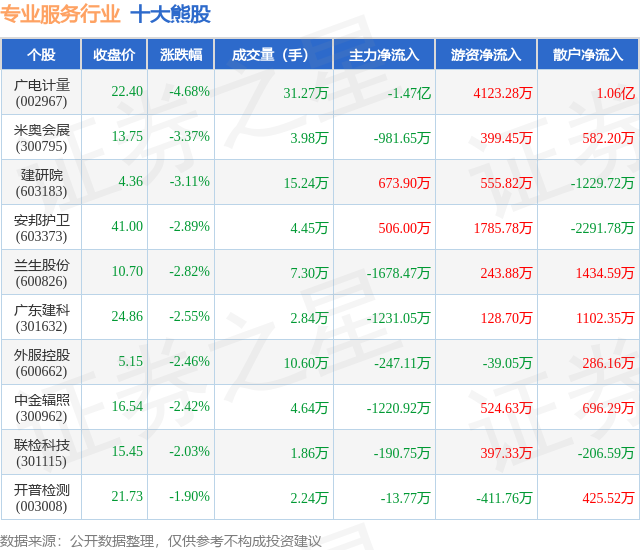 个股表现方面,专业服务行业当日领跌股为广电计量(002967),该股当日报收22.4,下跌4.68%,成交量31.27万,主力资金净流出1.47亿元。米奥会展(300795)以下跌3.37%紧随其后,该股当日成交量3.98万,主力资金净流出981.65万元。除此之外,建研院(603183)、安邦护卫(603373)、兰生股份(600826)均进入当日熊股之列。具体个股列表见下表: