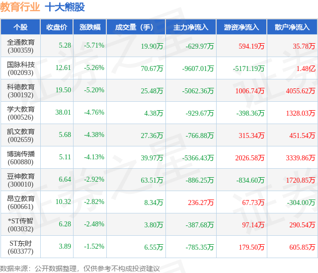 个股表现方面,教育行业当日领跌股为全通教育(300359),该股当日报收5.28,下跌5.71%,成交量19.9万,主力资金净流出629.97万元。国脉科技(002093)以下跌5.26%紧随其后,该股当日成交量70.67万,主力资金净流出9607.01万元。除此之外,科德教育(300192)、学大教育(000526)、凯文教育(002659)均进入当日熊股之列。具体个股列表见下表: